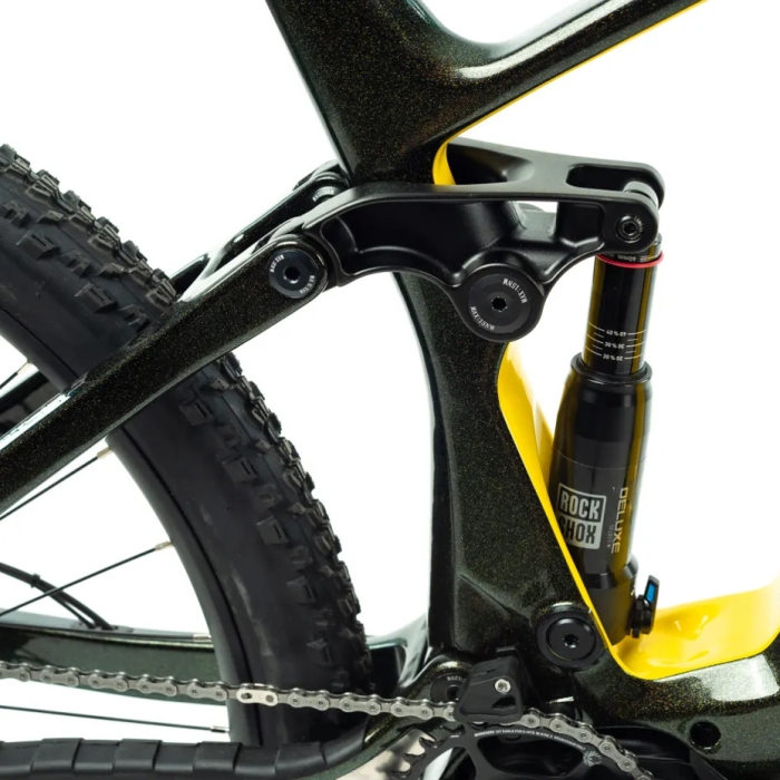 Vzduchom tlmená vidlica ROCKSHOX FS 35 Gold RL DebonAir 29" BOOST so zdvihom 150 mm skvele reaguje na hmotnosť cyklistu. Stačí upraviť tlak vzduchu vo vidlici a e-bike sa úplne prispôsobí záťaži aj štýlu jazdy. Vidlica potom skvele tlmí nárazy pri jazde v teréne, zatiaľ čo na rovnom povrchu zbytočne nepruží. Pruženie je možné uzamknúť z korunky vidlice. Ďalej je tu vzduchový zadný tlmič ROCKSHOX Deluxe Select + RT, 205x60mm. Jednoduchou úpravou tlaku vzduchu v tlmiči si e-bike nastavíte priamo pre svoju hmotnosť. Systém vzduchových pružín DebonAir+ zvyšuje tuningový potenciál a nastavenie dorazu „bottom out“ znižuje tvrdosť spôsobenú silnými nárazmi.