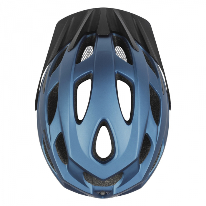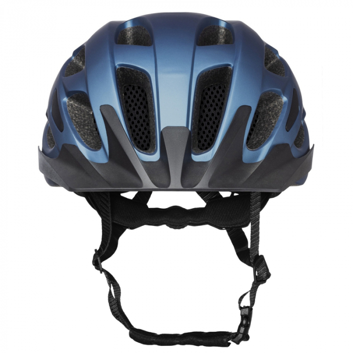 Modrá helma na bicykel má ľahkú In-Mold konštrukciu pre lepšiu bezpečnosť.