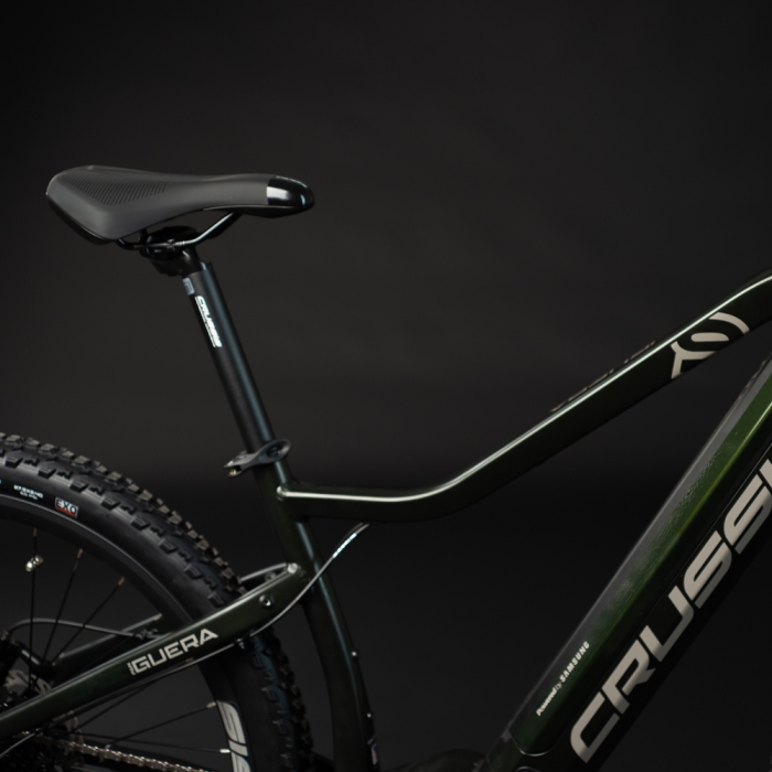 Crussis ONE PAN-Guera 9.8-M je super výkonný e-bike v jednofarebnom prevedení pre nekompromisnú jazdu na každom povrchu! Deviatkový rad luxusných horských elektrobicyklov je vybavený špičkovým motorom PANASONIC GX Ultimate, ktorý váži iba 2,95 kg a aj pri nízkej kadencii poskytuje vysoký krútiaci moment 95 Nm. Poháňa ho extra silná vysokokapacitná batéria 20 Ah Samsung, s ktorou prejdete v závislosti od terénu až 170 km! Stredový motor s integrovanou batériou prispievajú k dokonalému vyváženiu rámu, ktorý je vybavený zníženou rámovou rúrkou. Ďalej sa môžete tešiť na dvanásť-rýchlostnú zostavu SRAM SX Eagle. Kolesá s veľkosťou 27,5" sú obuté do priľnavých plášťov Maxxis Ardent a podržia vás tak v akomkoľvek teréne. Istú a pohodlnú jazdu vám zase zaručia kotúčové hydraulické brzdy a odpružená vidlica ROCKSHOX FS Judy Silver TK SOLO Air so vzduchovým tlmením a zdvihom 100 mm. Stupeň dopomoci nastavíte na farebnom LCD displeji, kde nájdete aj USB port na dobíjanie mobilu. S týmto bicyklom zažijete naozaj nespútanú jazdu!
