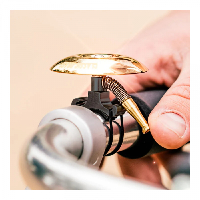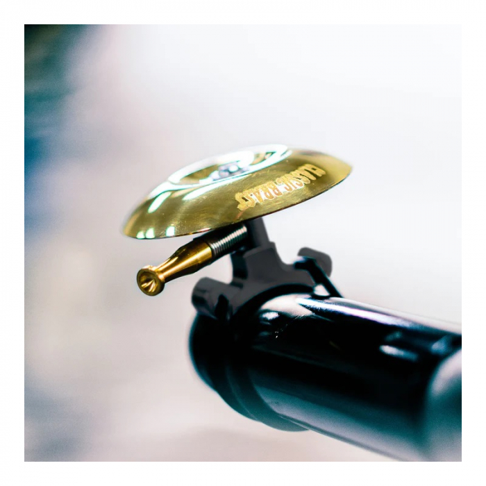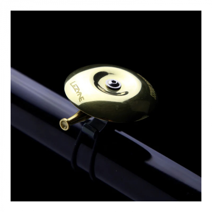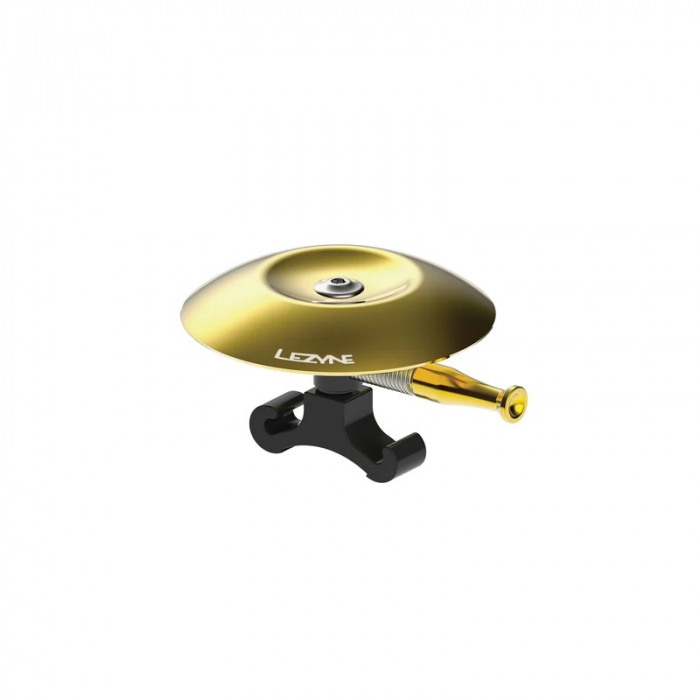 Zvonček na bicykel značky Lezyne.Štýlový zvonček v zlatom prevedení má tvar podobný činelu. Samotný zvon je vyrobený z vysoko leštenej mosadze a je pripevnený k robustnej, opracovanej hliníkovej základni.