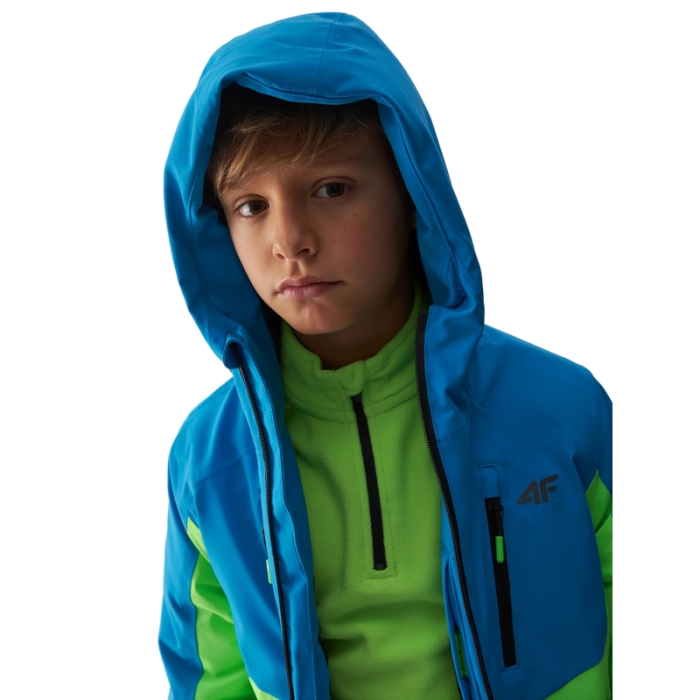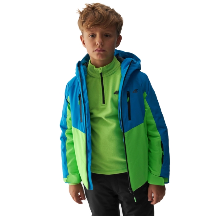 Chlapčenská bunda značky 4F.Bunda na lyžovanie vo výraznom zeleno - modrom prevedení upúta na prvý pohľad.