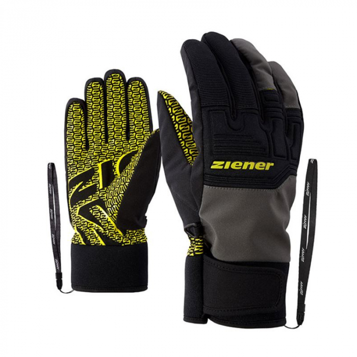 Pánske rukavice značky Ziener. Lyžiarske rukavice Garim AS v čierno-modro-zelenom prevedení sú na dlani potlačené nekĺzavou vrstvou z materiálu AMARA (odolný materiál podobný koži).Rukavice na lyžovanie budú spoľahlivo chrániť ruky aj v nepriaznivých poveternostných podmienkach vďaka nepremokavej membráne ZIENER AQUASHIELD®, ktorá je navyše aj vetruvzdorná.Rukavice do snehu majú užšiu neoprénovú manžetu, ktorá umožňuje dať časť rukavice pod bundu. Pomocou Z-Leash popruhov je možné rukavice dodatočne upevniť a zafixovať na mieste.