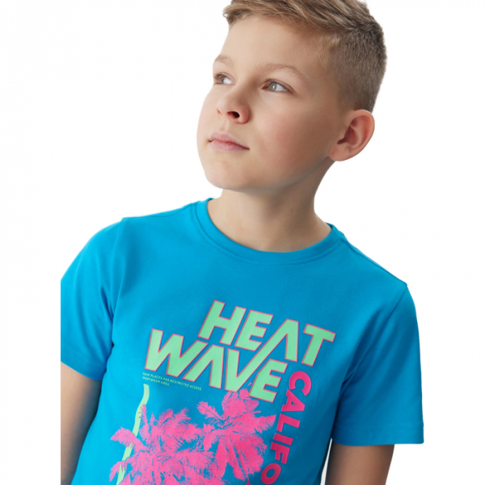 Chlapčenské tričko značky 4F Junior. Trendy tričko upúta peknou grafikou na prednej strane.Grafiku tvorí obrázok paliem a nápis Heat wave California.