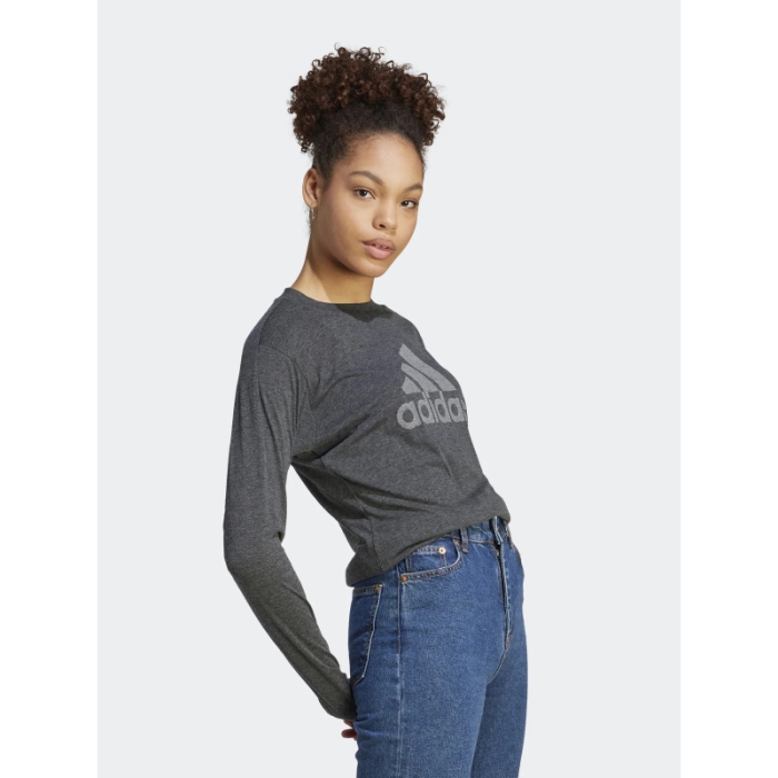 Tričko s dlhým rukávom má sivú farbu s melanžovým efektom a vpredu ho zdobí potlač loga adidas.