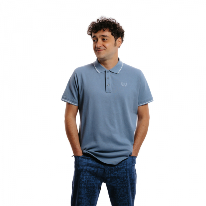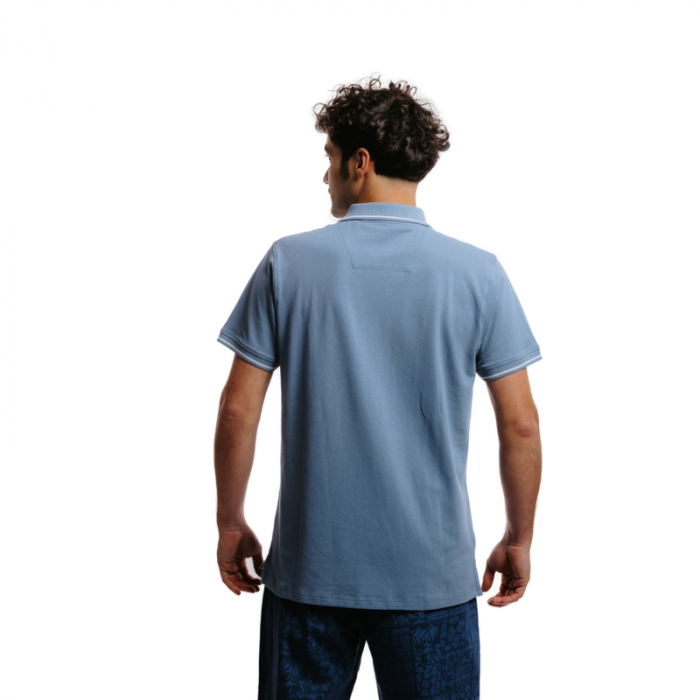 Tričko s golierikom má gombičkovú légu a zdobí ho jemná nášivka na hrudi. Golier a lemy rukávov navyše dotvárajú kontrastné biele prúžky.