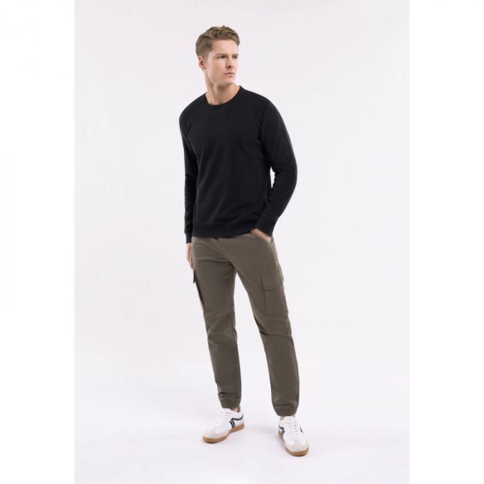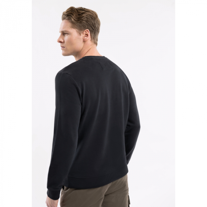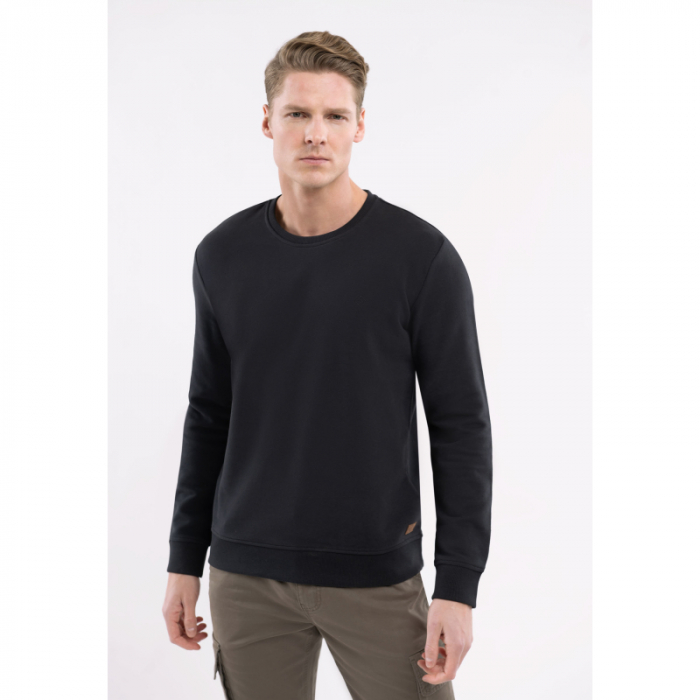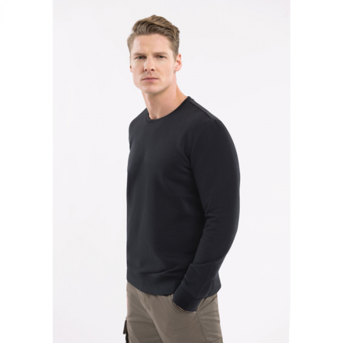 Čierna mikina nemá kapucňu a jej rukávy a spodný len sú zakončené manžetami. Tento obľúbený model pánskeho svetra má klasický strih, ktorý sa hodí na každý typ postavy.
