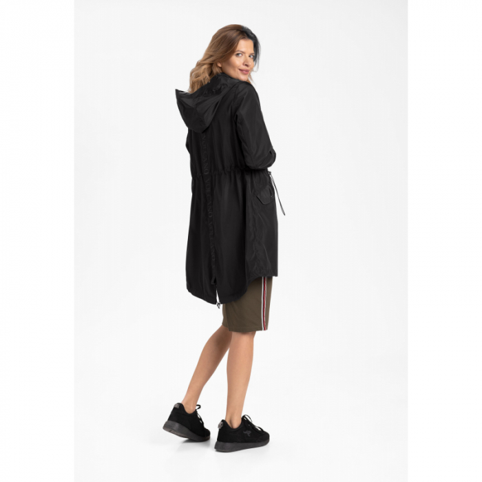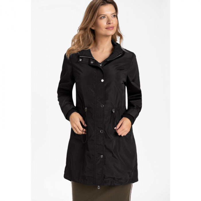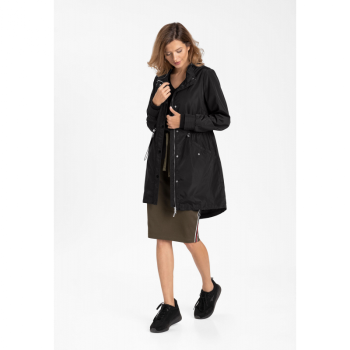 Čierny dámsky jarný kabát má športovo elegantný vzhľad.