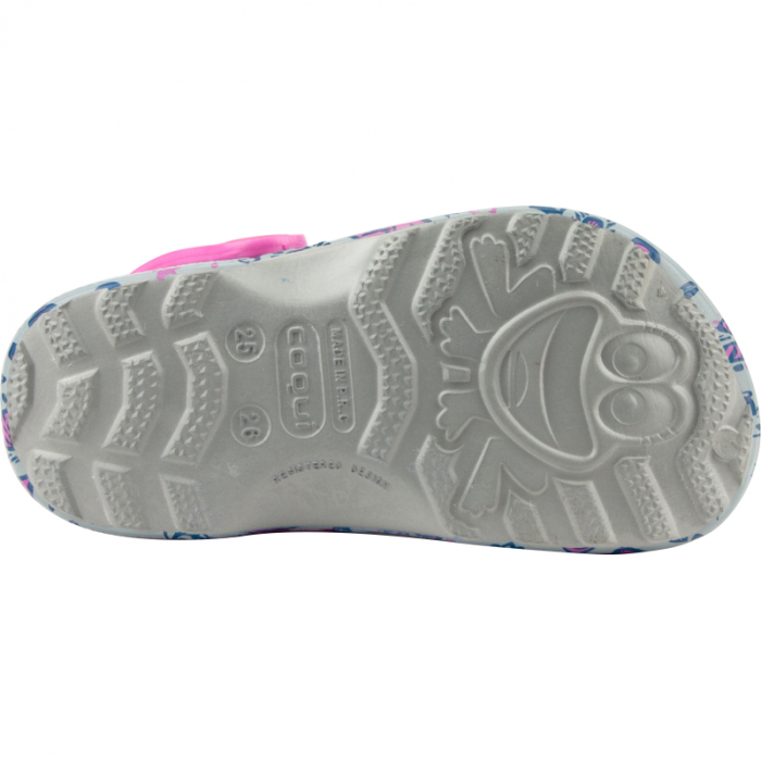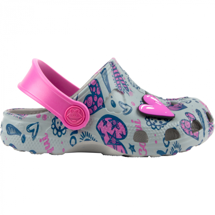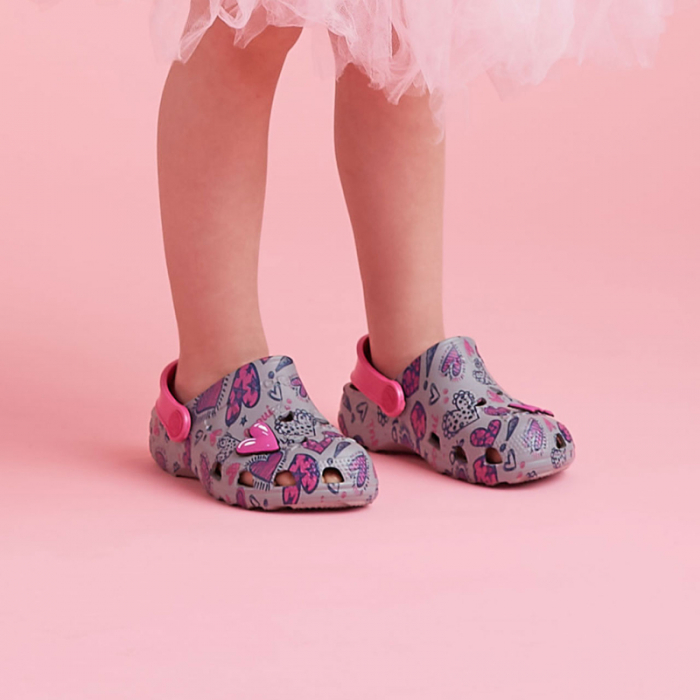 Dievčenská obuv značky Coqui. Kroksy pre deti zaujmú najmä malé parádnice krásnym dievčenským vzhľadom.Zvršok detských crocsov zdobí potlač srdiečok.