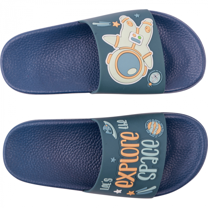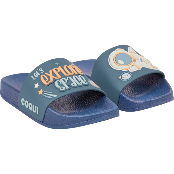 Chlapčenská obuv značky Coqui. Chlapčenské šľapky potešia chlapcov, ktorý majú radi vesmír.Popruhy zdobí nápis Lets explore the space a obrázok astronauta.