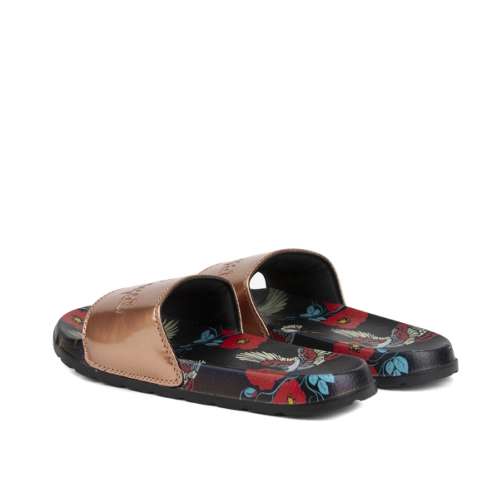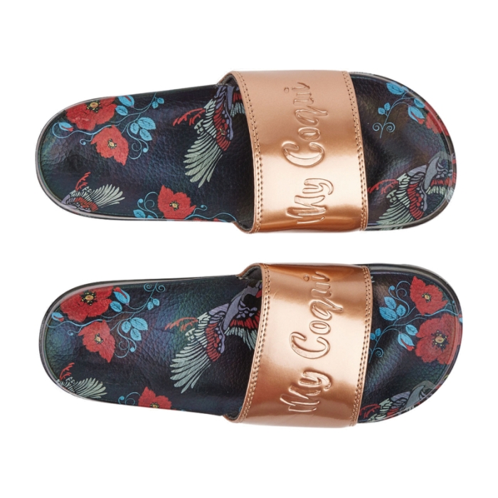 Dámske šľapky značky Coqui.Šľapky pritiahnu pozornosť krásnou potlačou na stielke, ktorú tvoria kvety a vtáci.