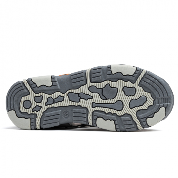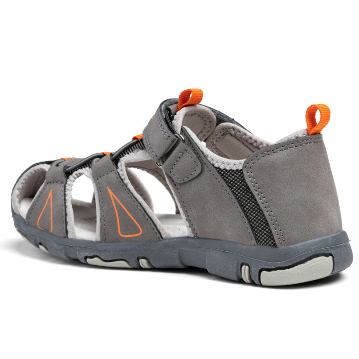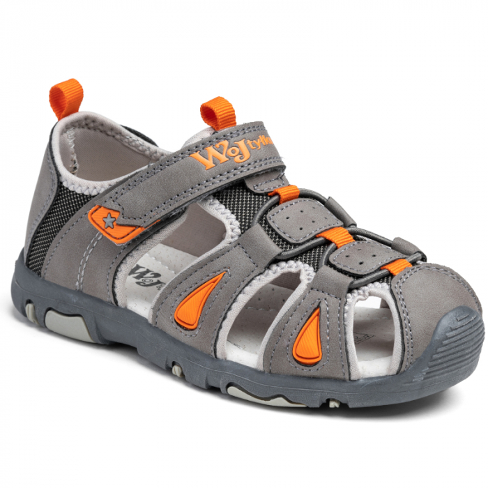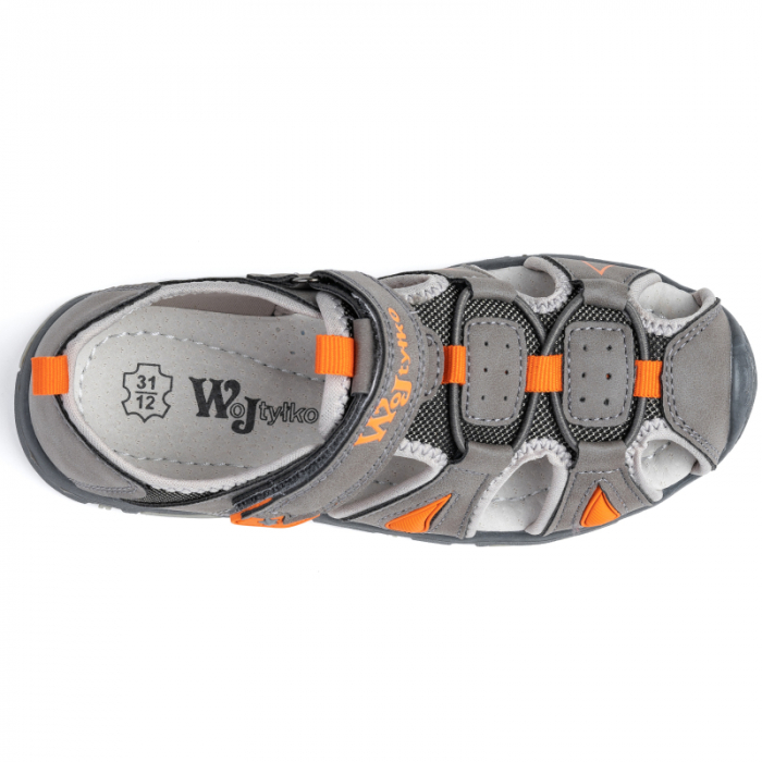 Chlapčenské sandále značky Wojtylko. Sandále majú prepracovaný dizajn.Dôraz je kladený najmä na praktickosť a funkčnosť. Sivé sandále zdobia oranžové prvky.