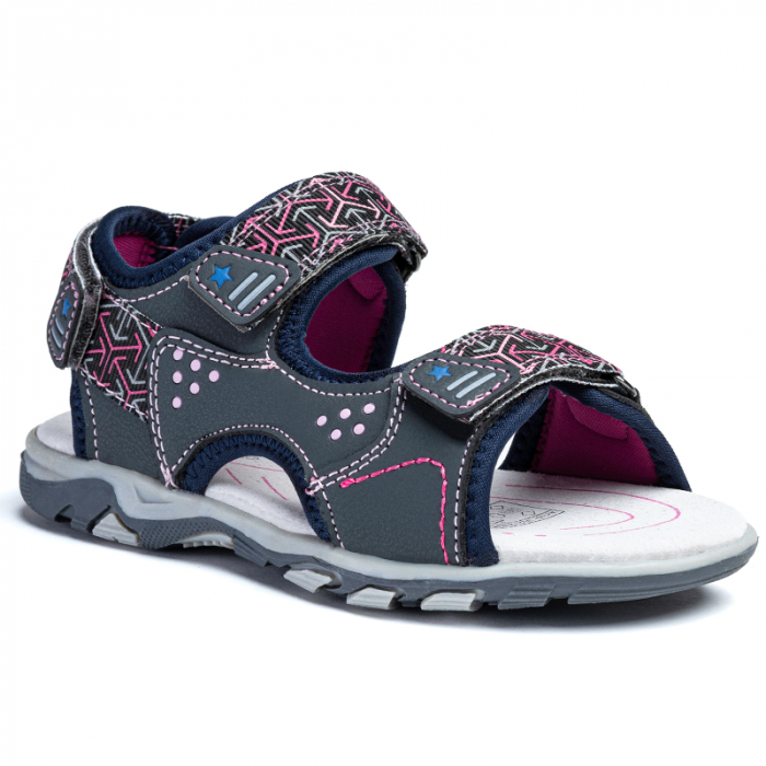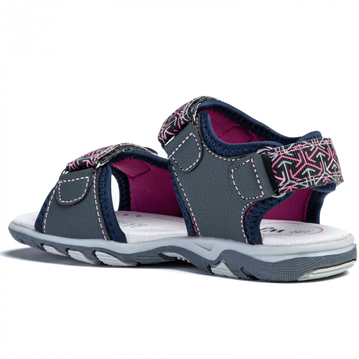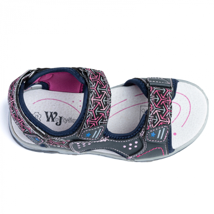 Dievčenské sandále značky Wojtylko. Sandálky sú navrhnuté v trendy dizajne a športovom štýle.Sivé sandále zdobí zaujímavý farebný vzor v oblasti popruhov. Detské sandále sú skvelé k letným šortkám a dievčenským legínam. Vďaka týmto sandálom vytvoríte vždy super look.Sandále pre dievčatá majú ľahko nastaviteľné popruhy na suchý zips. Benefitom je, že popruhy sú zo spodnej strany podšité textilným materiálom.