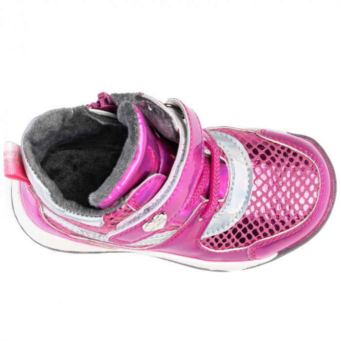 Detské zimné topánky majú mäkké polstrovanie okolo členka, ktoré bráni oderom a otlakom. Ružové topánky pre dievčatá sa zapínajú na elastické šnúrky a suchý zips.