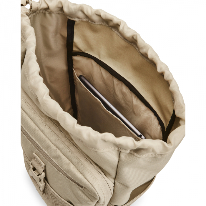 Hlavná komora sa zatvára pomocou sťahovacej šnúrky a je dostatočne veľká, aby ste si do nej uložili všetky cennosti, doklady a mobil.