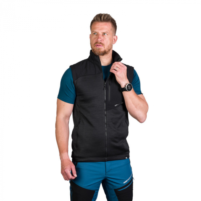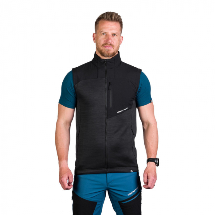 Pánska vesta značky Northfinder. Pánska turistická vesta v klasickej čiernej farbe s melanžovým efektom bude skvelým spoločníkom na horách. Flísová vesta má vodoodpudivú úpravu na ramenách a hornej časti chrbta.Výhodou je aj úprava proti žmolkovaniu.